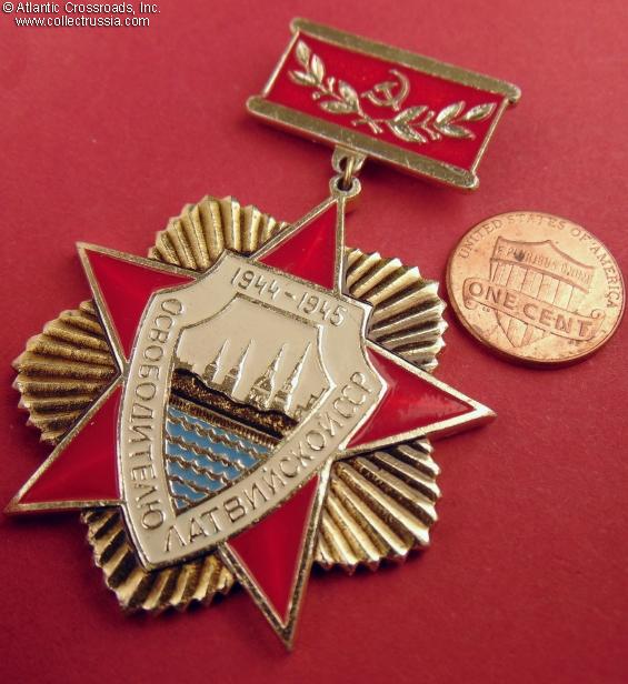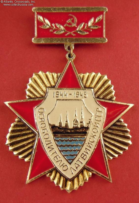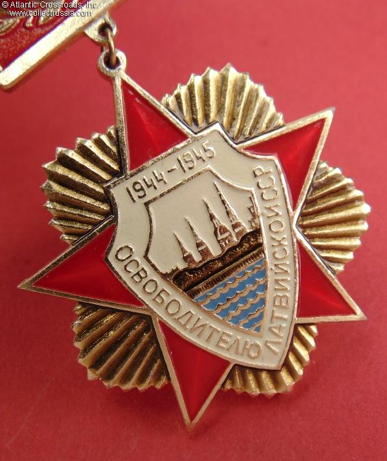 Anodized aluminum, paint, lacquer; the pendant is 52.3 mm in height incl. eyelet x 47.7 mm in width; overall height with suspension is approx. 69 mm. The Russian-language inscription reads "To a Liberator of Latvian SSR, 1944-1945". The center depicts the skyline of Riga. By its overall design and artwork this badge closely resembles the 1990 badge that commemorated the 45th anniversary of the liberation of all three Soviet Baltic republics. A very large and impressive award.