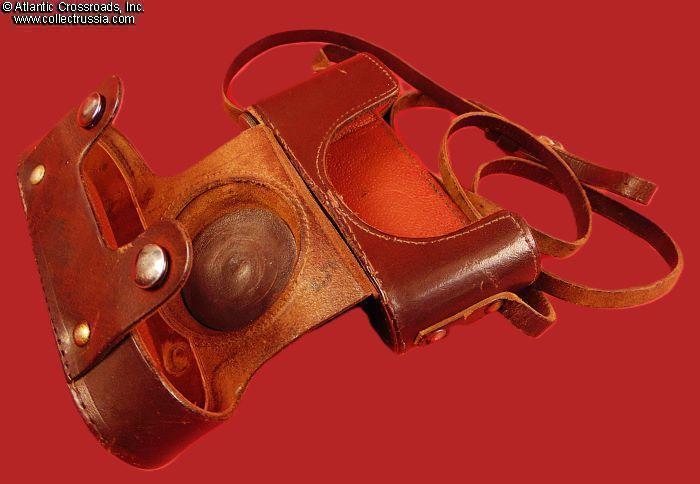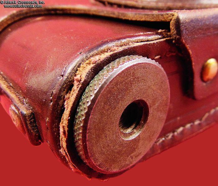The carrying case is original, in genuine leather, with the original leather shoulder strap, showing minimal scuffing to the outer layer of the leather. Unexpectedly little of the stitching is worn off, and only around the flat screw at the bottom that holds the camera in the case.