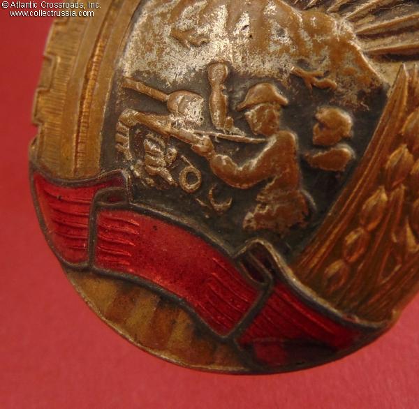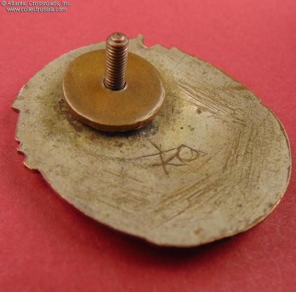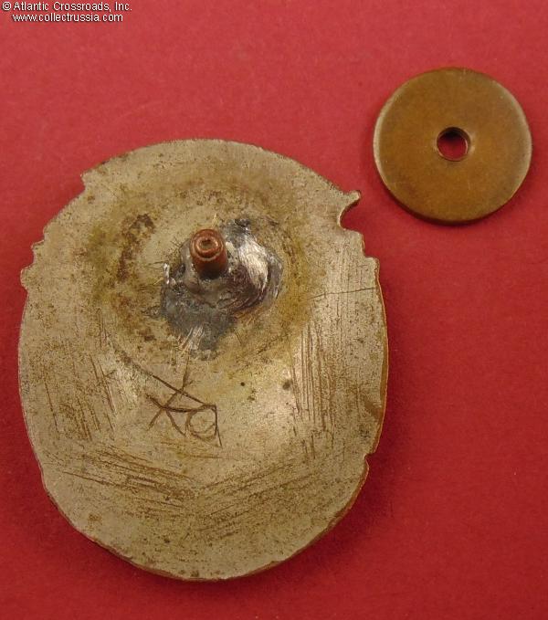 Early type in silver-plated and gilded brass and enamels; measures 37.9 mm tall x 31.4 mm wide; weighs 15.5 g without the screw plate. This version of the badge is almost certainly of Soviet manufacture.