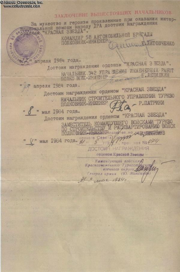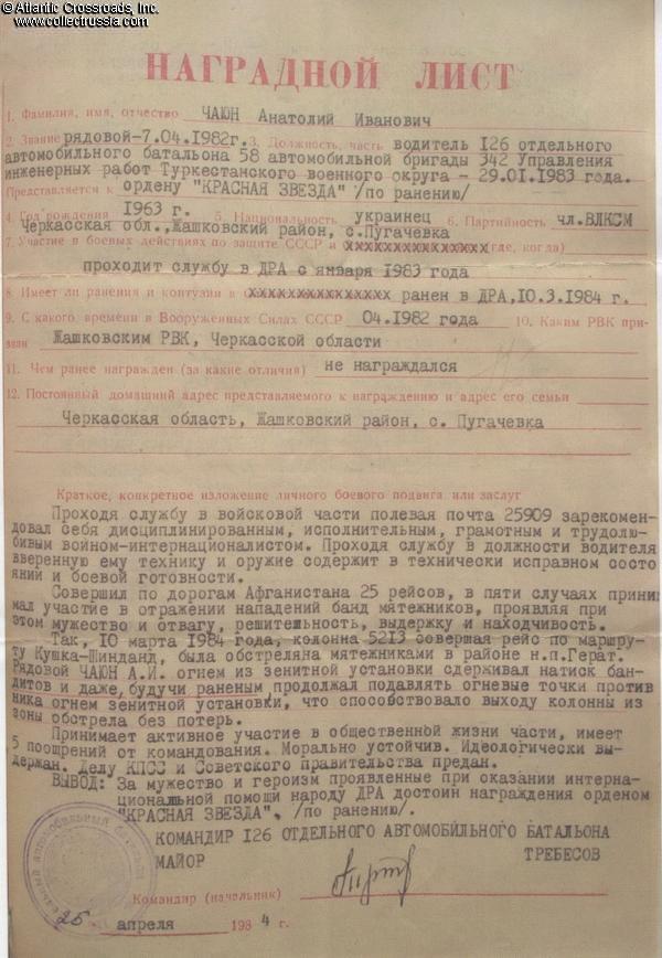 By March 1984, Chayun had completed 25 trips on Afghan roads, in five of which his column was attacked by mujaheddins. On 10 March 1984, he was participating in an automobile convoy en route from Kushka to Shindand, Herat Province. The convoy was ambushed by insurgents near the city of Herat about midway between the Soviet-Afghan border crossing at Kushka and the city of Shindand. Using the antiaircraft gun mounted on one of the trucks, Private Chayun proceeded to repel the attack and, even after being wounded, continued to suppress enemy fire, contributing to the convoy leaving the ambush area without loss of life. In recognition of his bravery, Chayun was recommended for the Order of the Red Star which was personally approved by Commander of the Turkestan Military District, General of the Army Maksimov and awarded to Chayun on 27 September 1984. This order was his only combat decoration. Decorations for Afghanistan were awarded rather sparingly and publicly available award commendations are infrequent. Fortunately, in this case we know exactly the cause for the award.