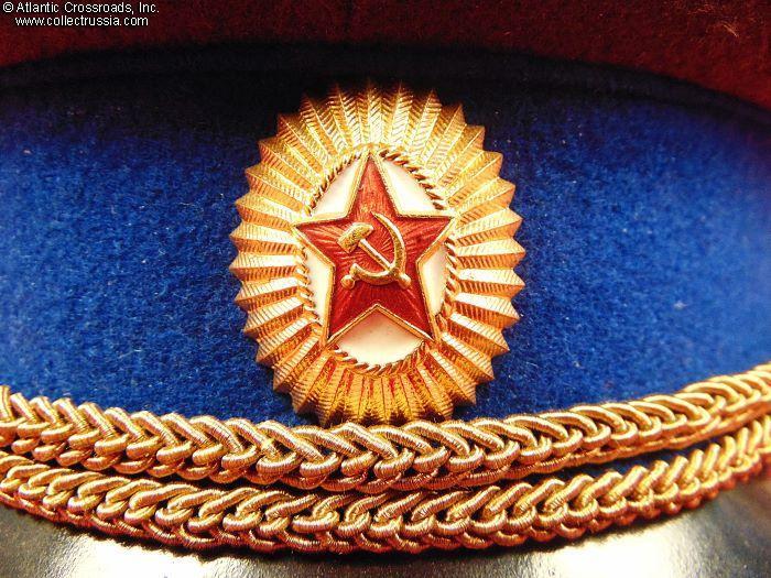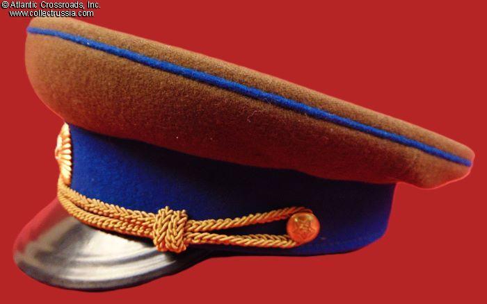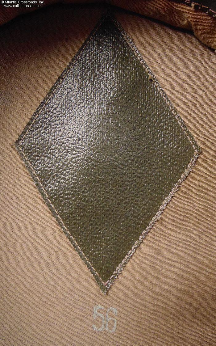 In napped olive drab wool with royal blue piping and band. Early style small rounded visor and distinctive smaller crown. The officer hat badge is of the early type, in brass and high-quality enamels. Complete with gold chin cord. The sweat diamond has a logo of the Moscow Krasnyi Voin ("Red Warrior") Headgear Factory and shows the 1957 date of manufacture. The stamped logo and lettering of the sweat diamond is very indistinct and hard to read, becoming somewhat legible only at a certain angle to a bright light. The liner is marked size 56 (US 7 / Medium). The inside of