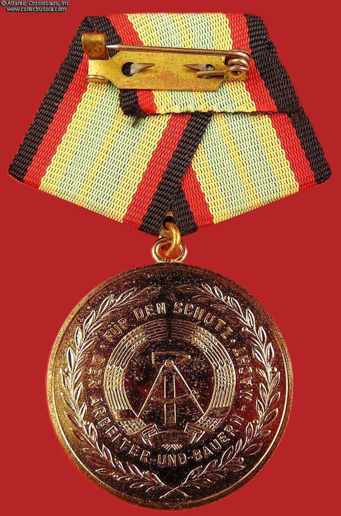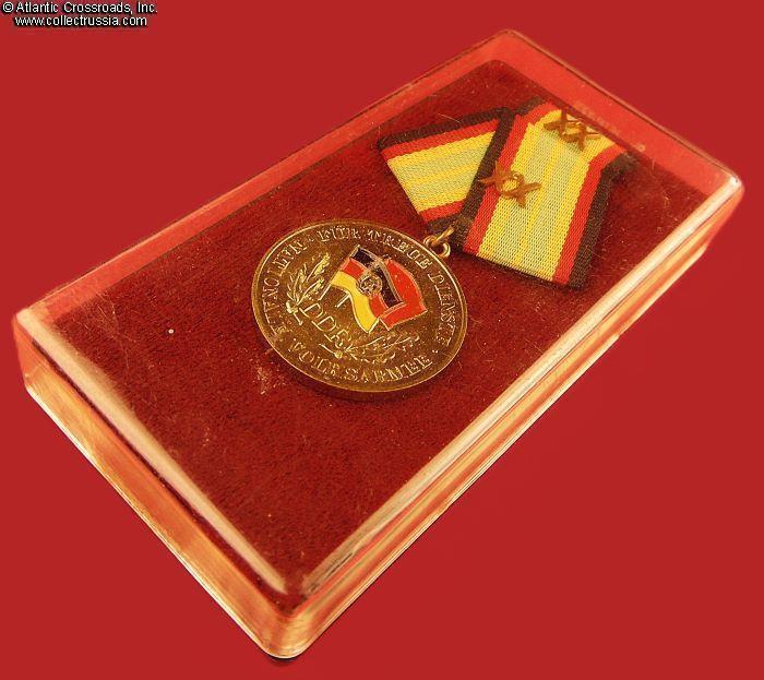 Brass gilt, enamels; the medallion measures 35.1 mm wide and weighs 19.5 g. The inscription encircling the obverse reads "For Faithful Service, DDR National People's Army". The inscription around the Est Germany state emblem on the reverse reads "For Protection of the Workers' and Peasants' Power." The original presentation box has black plastic bottom lined with light foam rubber inside, the lid is in Plexiglas.