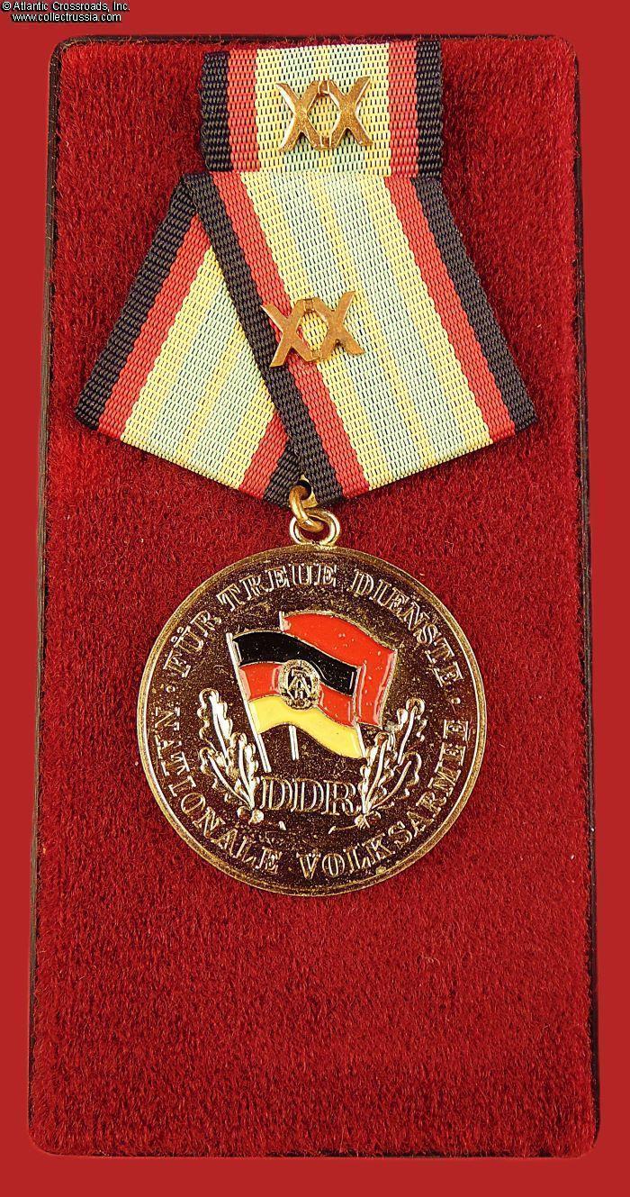 The medal (original name "Medaille für treue Dienste in der Nationalen Volksarmee") was instituted on 1 June 1956 in four grades: bronze for 5 years of service, silver for 10 years, gold for 15, and gold with colored flag and Roman numerals "XX" on the suspension and ribbon bar for 20 years of service. It was presented to members of the NVA and Stasi, as well as individuals who actively supported the NVA and Stasi.