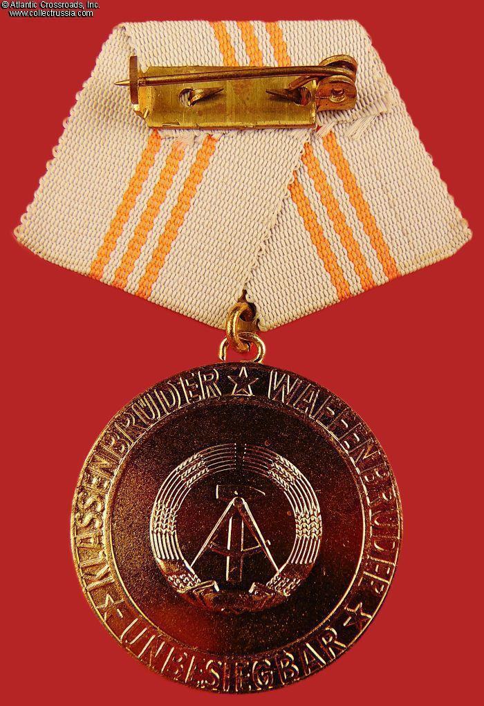 The medal (original name "Medaille der Waffenbrüderschaft") was established in 1966 in three classes (bronze, silver, and gold), and was presented to NVA soldiers and civil employees, members of the Stasi, members of the armed forces of other Warsaw Pact countries, and individuals of friendly socialist countries for strengthening the cooperation and brotherhood in arms among the armed forces of the Warsaw Pact.