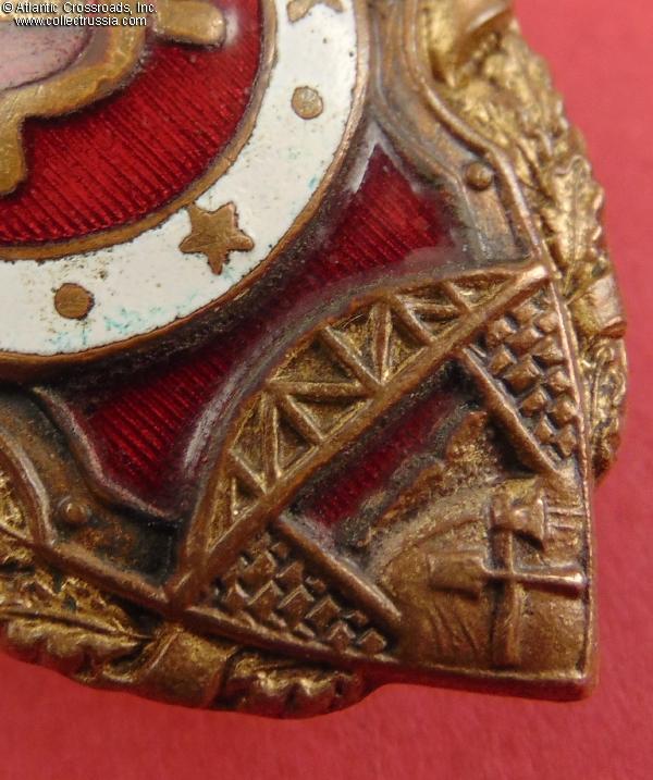 Brass, enamels; 45.9 x 35.4 mm; weighs 15.4 g without the screw plate. This is one of the early versions of the badge almost for sure manufactured and issued during the war. It features a highly domed center medallion, nicely detailed artwork of the wreath, and very distinctive tall ornament above the shield with five "incomplete" scrolls and a "dimple" at the base. There is a pattern of vertical lines under the red enamel on the center medallion and in the lower portion of the badge. The reference guide Red Army Breast Badges of Excellence (1942-1957) by Khlamkin classifies this badge as Type 3 and mentions that it was made by YuKhA, while the Airapetyan's catalog refers to it as the 2nd version and states - apparently erroneously - that it was produced by the NKPS. Both reference guides give this version of the Road Builder's badge a very high 4 out of 5 rarity rating.