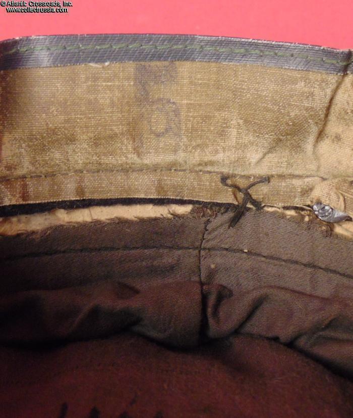 The hat is in outstanding, excellent condition. It has kept its compact shape perfectly. The crown and band show none of the usual moth bites or stains, which is extremely uncommon for any early Soviet hat made of wool. Both the exterior and interior are perfectly clean, free of the usual stains or soiling. Unlike most other hats of the period, the liner and sweatband are original and have not been refitted. The chinstrap is likewise original; although it is somewhat stiff, slightly warped and shows a minor amount of wear, it remains sound, intact and presentable. There is only a modest amount of wear to the edge of the brim and the sweat band. The visor is perfect.