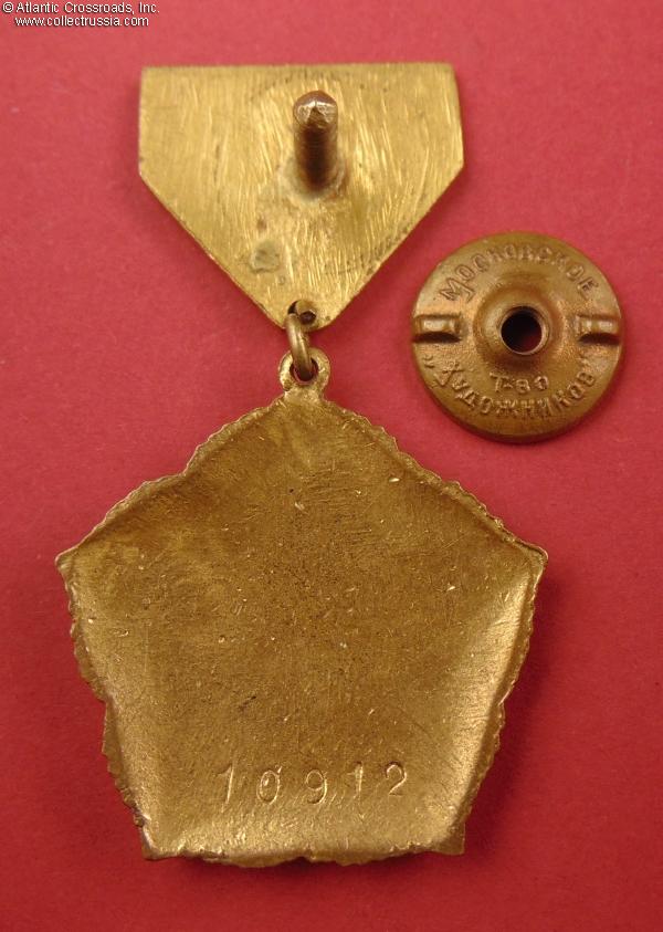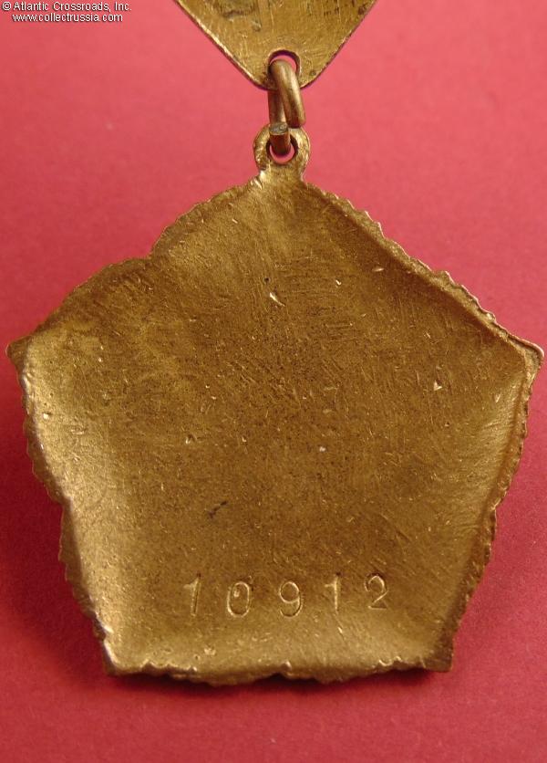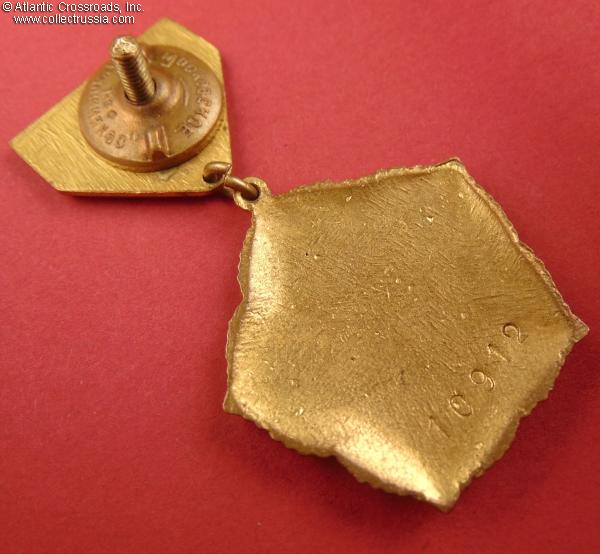 In outstanding, excellent condition. The enamel is perfect on both the numeral and suspension. The gilt on the medallion is extremely well preserved and bright with only an attractive mild patina, no significant tarnish or blemishes. The screw post is full length, well over 12 mm, and includes an original screw plate marked "Moscow Artists Cooperative".