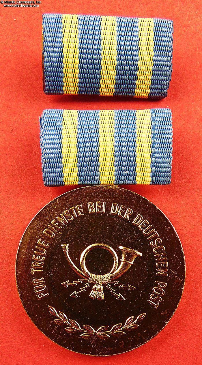 The Medal for Loyal Service in the German Post (original name "Treuedienstmedaille der Deutschen Post") was established on 13 October 1960 in five grades:10 years of service (bronze), 20 years of service (silver), 30 years of service (gold), 35 years of service (gold with honor clasp for women), and 40 years of service (gold with hono