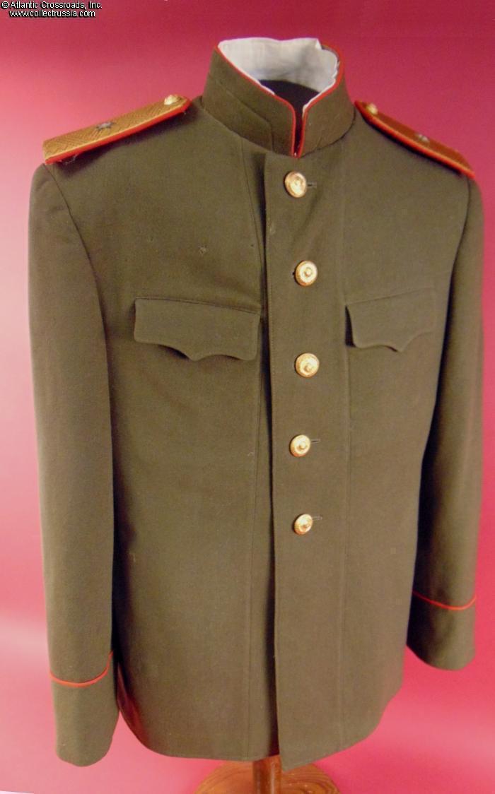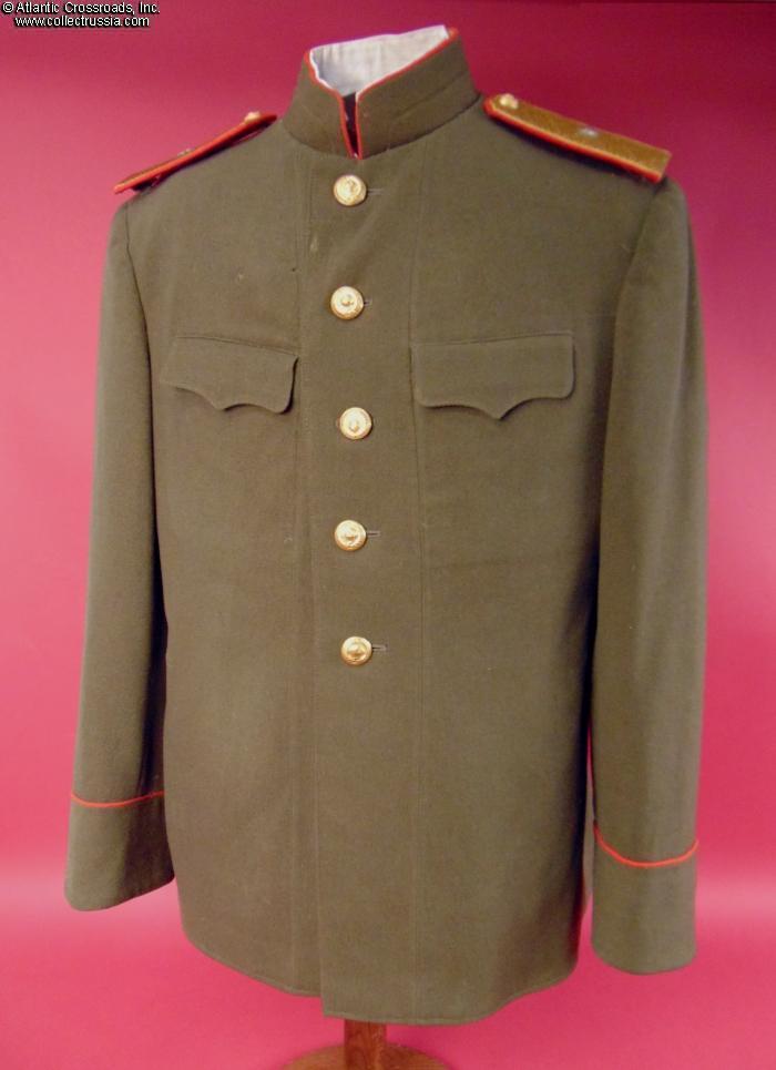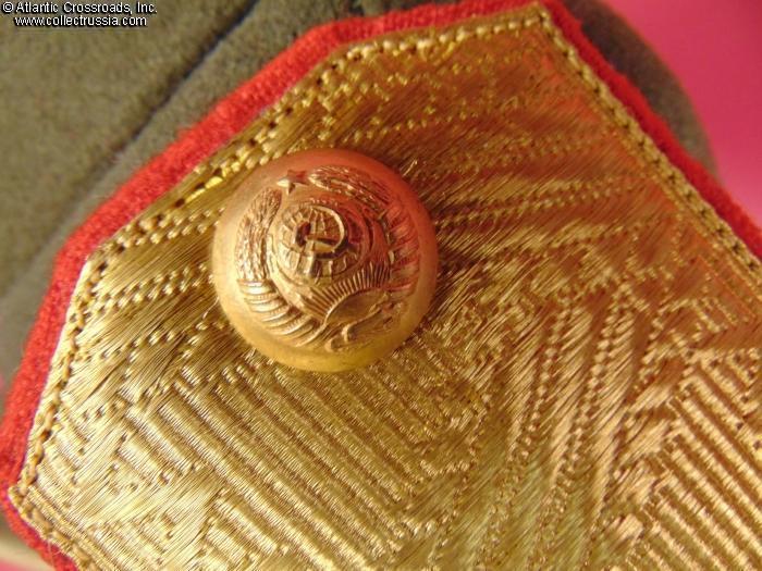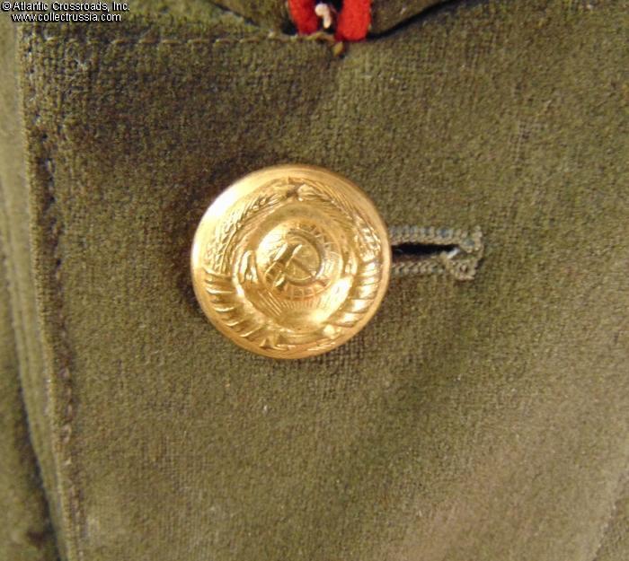 The tunic is in napped olive-green wool of characteristically fine early quality. Features stand-up collar and internal breast pockets with flaps, and red piping on the collar and cuffs. Shoulder boards are in gold bullion embroidery with embroidered silver stars. The front buttons are of WW2 type, all of them in gilded brass and with 11 scrolls in the Soviet national emblem representing the number of Soviet republics (the type used from 1937-1946); most of the buttons have the Moshtamp stamp on the reverse without a date, as standard for WW2- vintage buttons, while one has an un