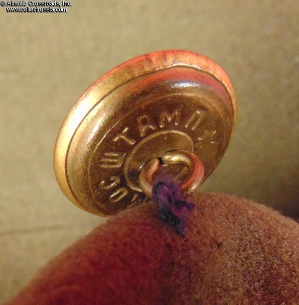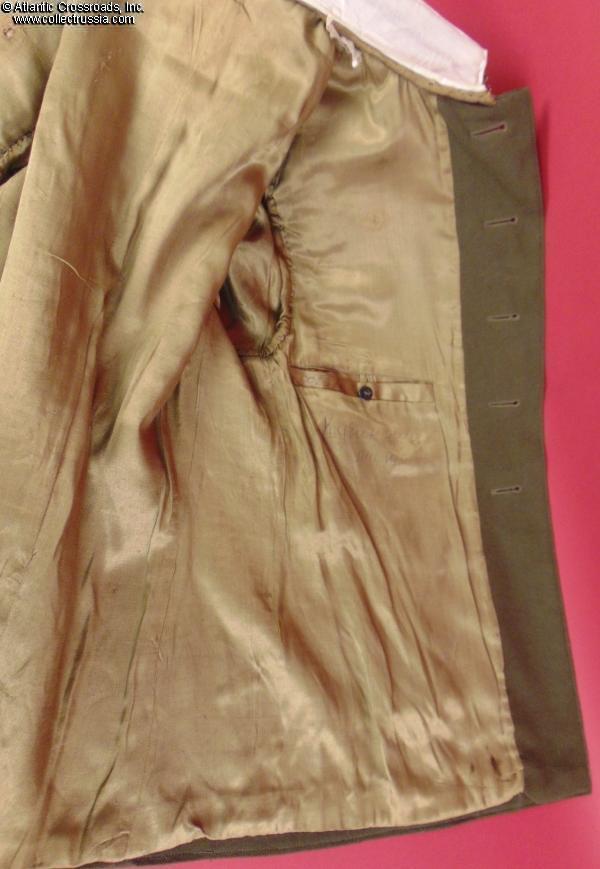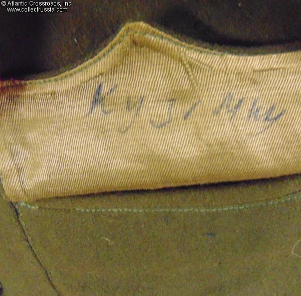 The liner shows minor wear and a couple of faint stains but is overall clean and sound. The chest has several holes from decorations worn by the original owner; however, none are conspicuous when viewed from the front. There is a numeral "OO2314" inscribed in blue ink at the inside pocket opening on the liner, possibly an inventory number. Just below it is a two-line inscription in ink; only the first word, "Kuchinskiy," is clearly legible?likely the owner's name. Additionally, there is an inscription "6612" on the inside right sleeve liner, apparently a tailor's mark. The shoulder boards have some moth bites on the felt underside but the gold uppers and piping are perfect.