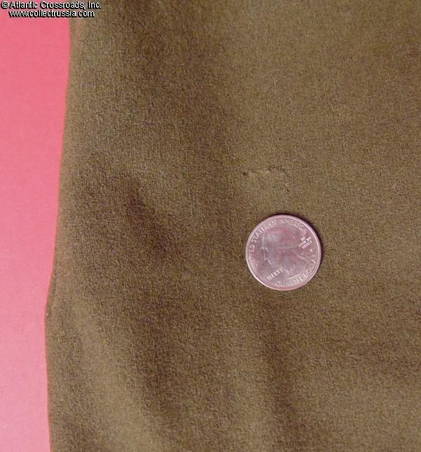 In very good condition, outstanding for a Soviet military uniform of the WW2 era. Both the wool outer material and red piping are completely free of significant mothing, heavy soiling or major wear of any kind. There is a single very small (approx. ½") area of discoloration at the front between the two upper buttons, which is not too noticeable. Minor moth tracks are on the nap of the wool on the back, but the tunic is completely free of moth holes or bites?which is quite uncommon for a Soviet WW2-era garment made of wool. There are two tiny, less than one- inch-wide areas on the back about 5" from the bottom hem where torn original outer fabric was carefully resewn in place. The repair was done so professionally that it's only noticeable upon close inspection under bright light. Additionally, faint green stains on the back blend so well with the olive drab wool that they are almost invisible at a regular viewing distance and certainly do not detract from the tunic's appearance under normal lighting conditions.