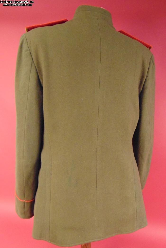 The tunic is in napped olive-green wool of characteristically fine early quality. Features stand-up collar and internal breast pockets with flaps, and red piping on the collar and cuffs. Shoulder boards are in gold bullion embroidery with embroidered silver stars. The front buttons are of WW2 type, all of them in gilded brass and with 11 scrolls in the Soviet national emblem representing the number of Soviet republics (the type used from 1937-1946); most of the buttons have the Moshtamp stamp on the reverse without a date, as standard for WW2- vintage buttons, while one has an unmarked back painted olive-drab. The hollow-back shoulder board buttons are likewise a WW2 eleven- republic version. The liner is in fine satin fabric; the internal breast pocket is lined in sturdy grey cotton. The neck liner is in white cotton.