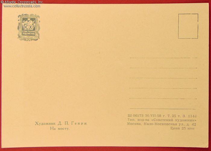 The size is continental standard 6" x 4", postally unused and unmarked, published by the Soviet Artist Publishing House, circulation 25,000, very low by Soviet standards. The artwork is an offset print of an oil-on-canvas painting by D. Genin, depicting a train exiting a bridge on its way out of Moscow, with a faint silhouette of one of Stalin's high-rises in the background. The name of the artist is printed in the lower left-hand corner on the reverse.
