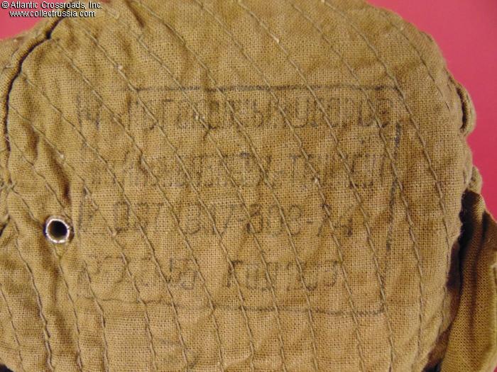 In rough olive drab cotton twill. The type with standard Soviet metal buttons painted olive green. Comes with a period EM hat badge. The liner shows a stamp of the Akhunbaev Headgear Factory in the city of Tashkent, capital of Soviet Uzbekistan, with a 1983 date of manufacture. Marked Size 55, corresponding with a US size 6 7/8, Small.