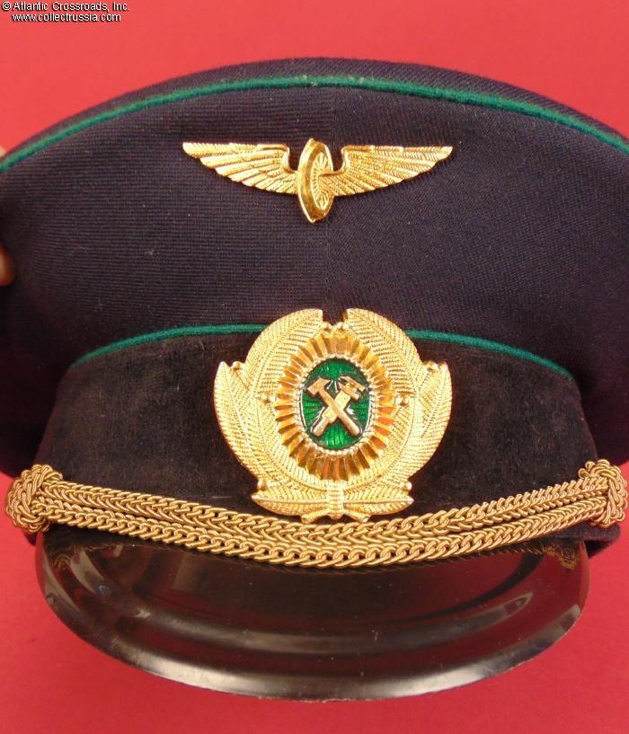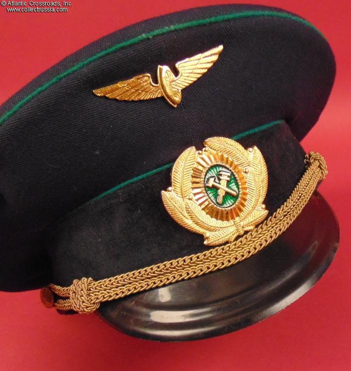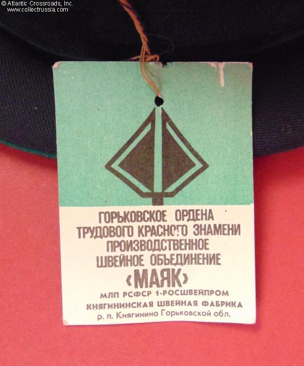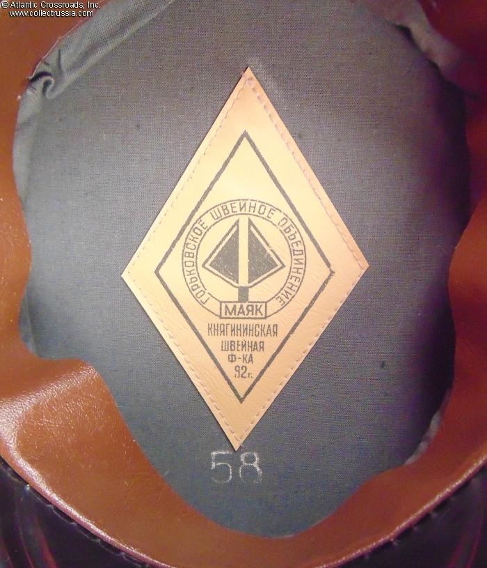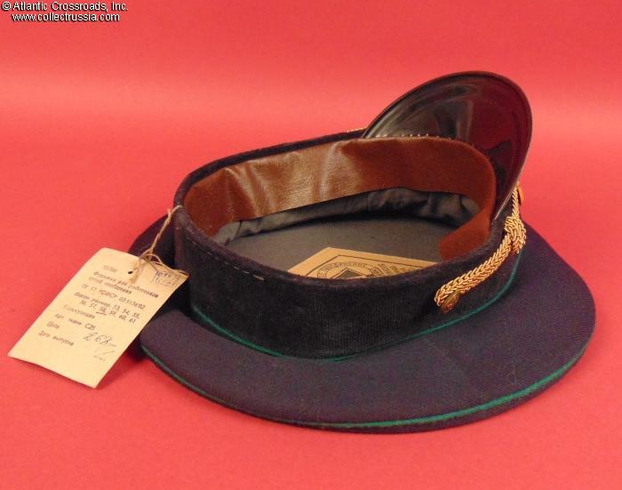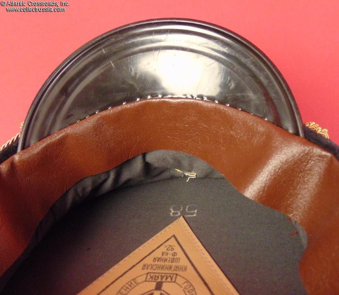 The crown is in blue gabardine with green wool piping and a black velvet band. Comes complete with the Ministry of Transportation cockade and "wheel with wings" emblem on the top of the crown. The chin cord is gold filigree (correct for a top or mid-level official); the side buttons are a special type with the wrench and hammer railroad insignia. Black plastic visor. The sweat diamond shows a logo of the Knyagino Garment Factory in Gorky Region and a 1992 date of manufacture (the year following the collapse of the USSR, well before the introduction of new Russian uniforms and insignia).