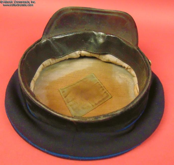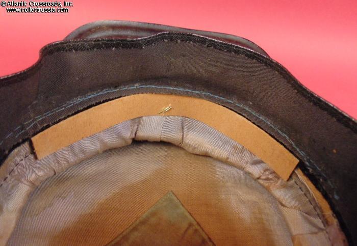 Very good to excellent condition. The crown and band are completely free of moth damage. There is a single spot on the underside of the crown near the right temple where a small piece of blue gabardine fabric is torn, but because it is covered by the overhanging part of the crown, it will be completely hidden from view when the hat is displayed by itself or on a mannequin head. The hat has kept its shape perfectly over the years; the visor is tightly attached and intact, not warped as is often the case. The exterior is perfectly clean. The liner, despite sweat staining, is generally well-preserved and free of excessive wear. The oilcloth sweat band is likewise in excellent shape.