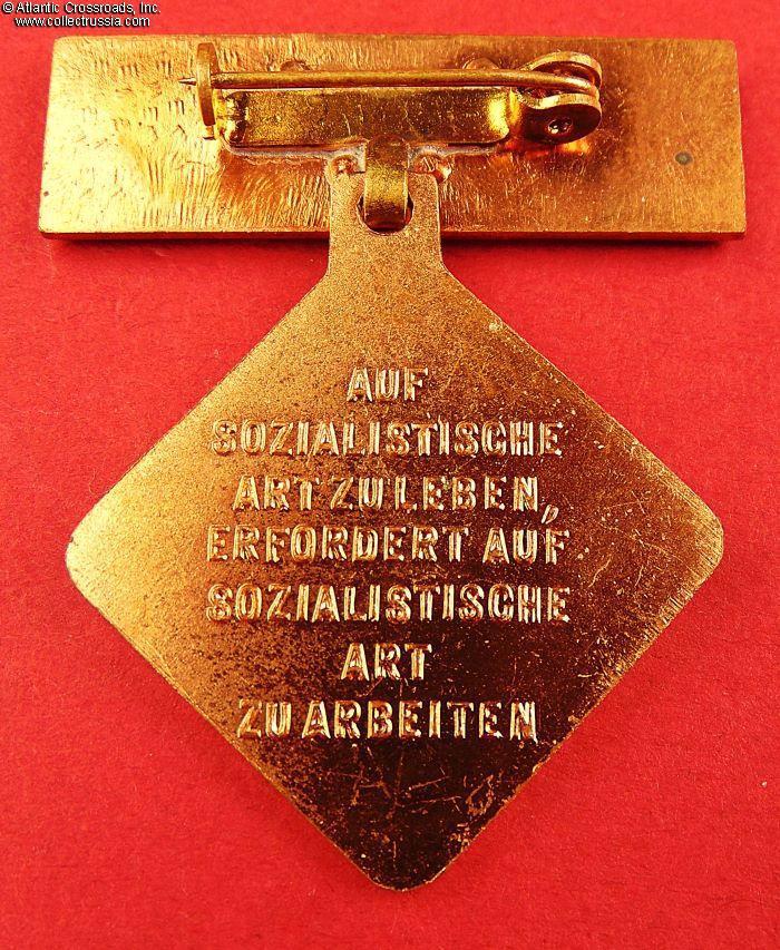 Rhomboid medallion in brass and paint, measures 25 mm square. The suspension bar is coated in clear resin. Two state emblems on the suspension signify second award. The raised inscription on the reverse reads "to live in a socialist way requires working in a socialist way."