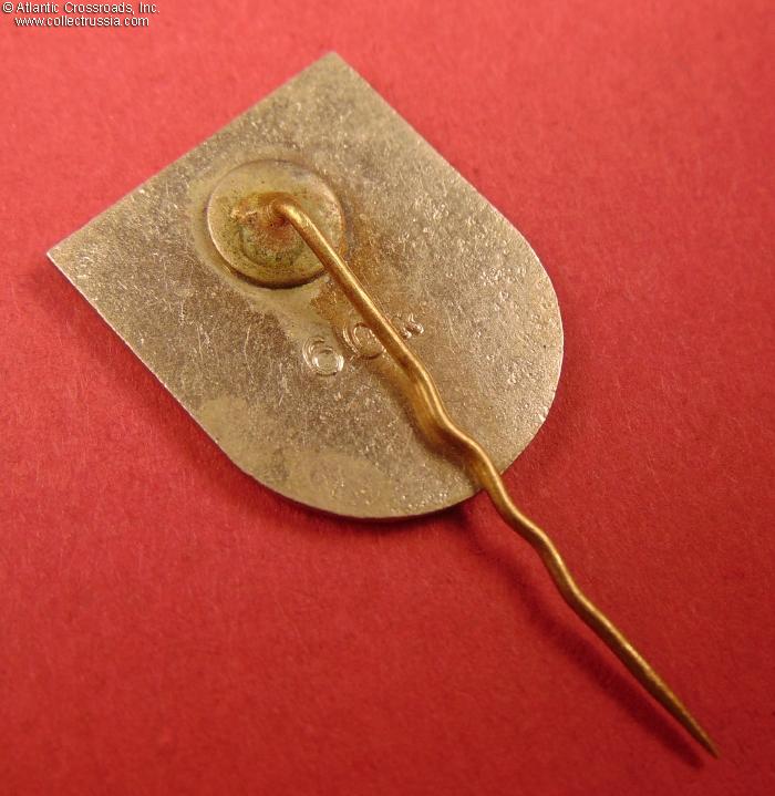 Nickel-plated brass, enamels; measures 22.9 x 19.2 mm. Features the colors of the national flag of the Latvian SSR and inscription in Latvian. The quality of this badge is much higher than a typical Soviet souvenir pin of the period. Although it shows a retail price of 60 kopeks on the reverse, this very attractive and well-made piece may have been intended primarily as a commemorative gift to Latvian WW2 veterans and VIPs.