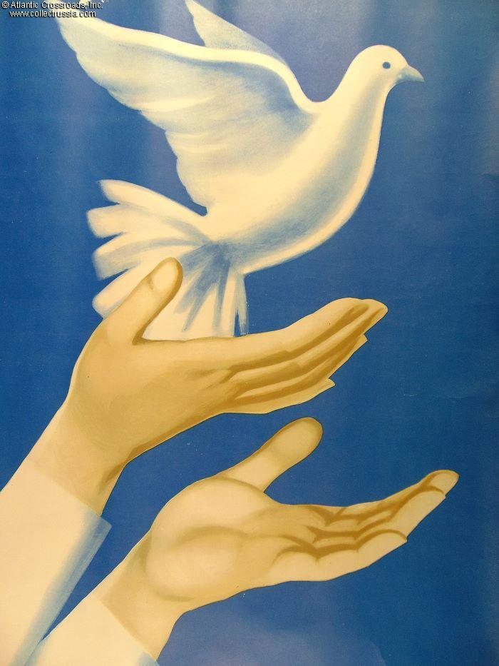 In very good to excellent condition: the spot above the white dove where the surface layer of the paper is stripped off shows white paper underneath and so is unfortunate but not all that intrusive to the eye. Other than that, there is mild wrinkling and tiny bumps to the edges, not very obvious against the large area of the poster.