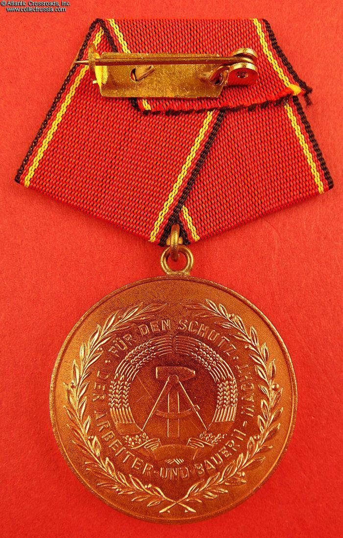 In brass, measures 35 mm wide. The raised inscription on the obverse, encircling the bas-reliefs of representatives of three branches of the NVA - Army, Air Force, and Navy, reads "For Outstanding Service in the National People's Army of the GDR." On the reverse, the inscription encircling the GDR state emblem reads "For Protection of the Workers' and Peasants' Power." The presentation case has black plastic bottom lined with light foam rubber inside, the lid is in Plexiglas.