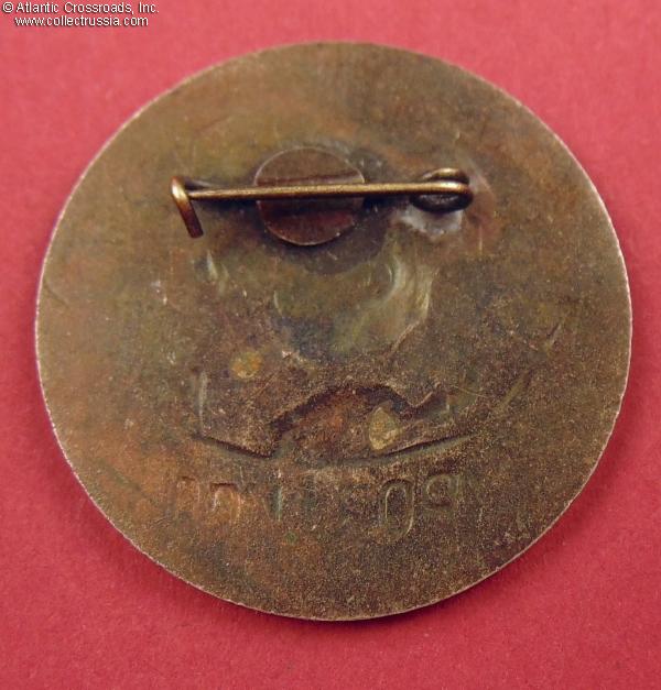 Silver-plated brass, "cold" enamel; measures 32.4 mm wide. The center features a bas-relief portrait of Sergei Kirov, a Bolshevik leader assassinated in 1934 on Stalin's orders. The inscription is in Russian. A very well-made piece. Excellent condition.