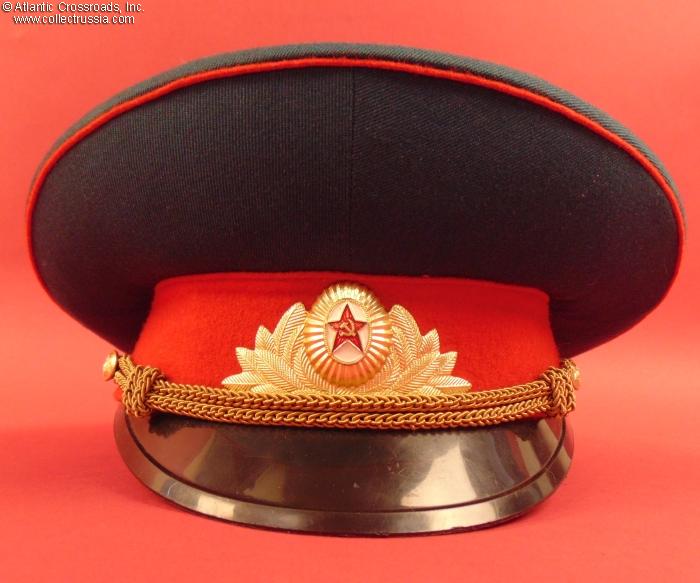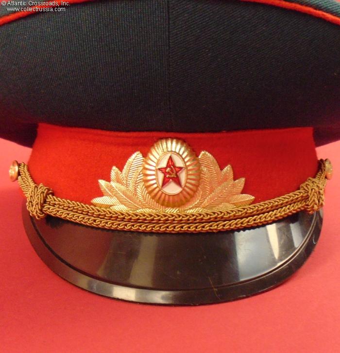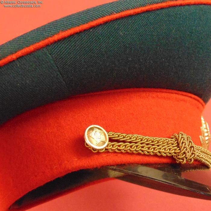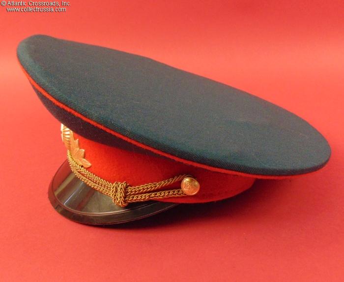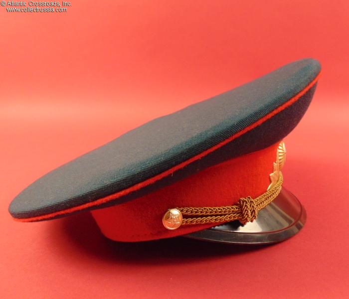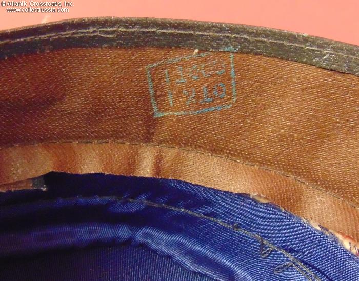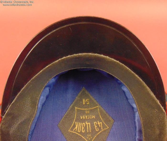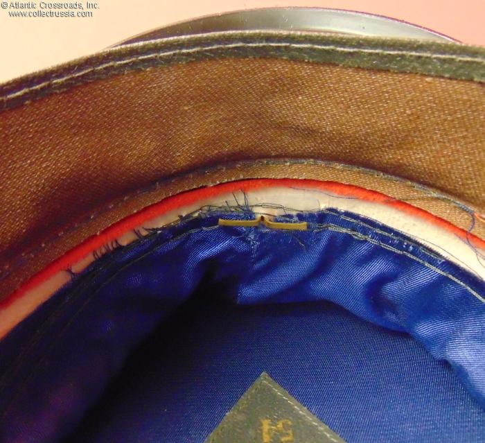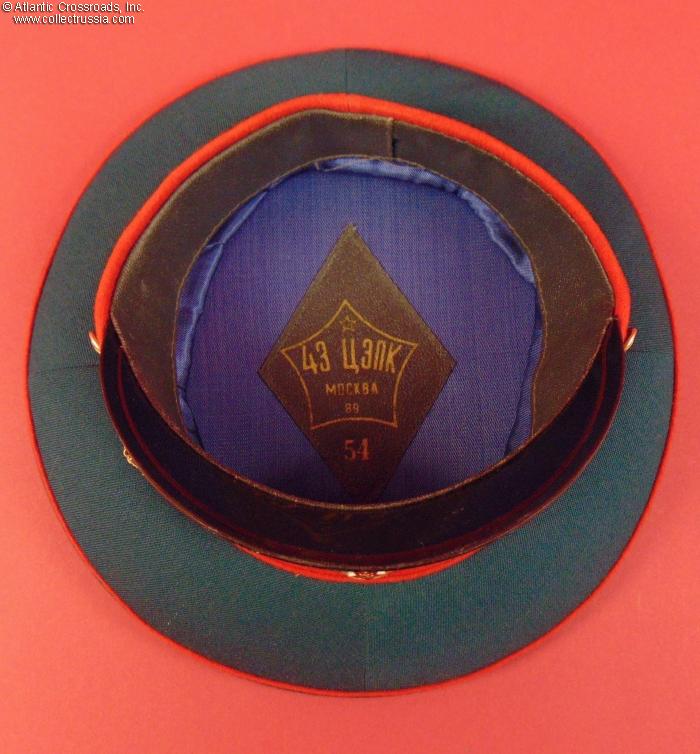 The crown is in wave-blue wool blend gabardine with a red velvet band and piping. Includes the original chin cord in gold filigree and the correct full-dress officer cockade. The sweat diamond of the TsEPK Military Garment Factory in Moscow shows a 1988 date of manufacture and Size 54 (US size 6 ¾ / Small). There is a factory quality control stamp on the underside of the sweat band.