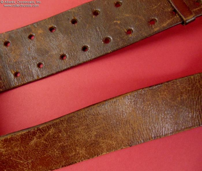 In very good condition. The leather shows a moderate wear and light scuffs from normal use, but remains sound, soft and attractive. There are no tears or stains. The nickel plating on the buckle is well preserved, having some tarnish but no underlying rust or pitting.