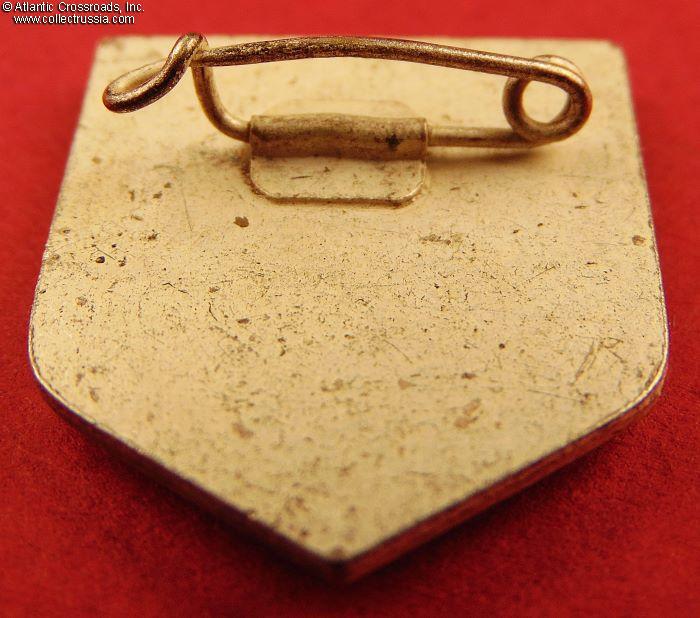 In light nonferrous metal, paints and clear resin; measures 25 mm in height, 22 mm in width. Excellent condition, minor cracks to the clear resin at the bottom are barely noticeable and not detractive. The pin attachment is intact and fully functional.