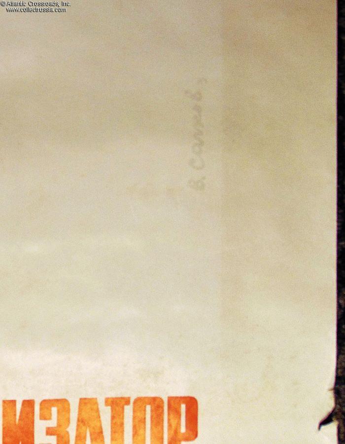 VERY LARGE format: when fully assembled, the poster measures 41 ½" x 77". Published by the PLAKAT ("Poster") Publishing House, Moscow, circulation 30,000, very small by Soviet standards. Printed on glossy paper. The artist's name, V. Sachkov, is printed in the lower left-hand corner of the poster. His hand signature is very faintly visible near the right-hand corner, written vertically. The phrase in red under the imagery is Lenin's quote about the importance of newsprint in communist propaganda. It reads "A newspaper is not only a collective propagandist and collective agitator, but also a collective organizer."