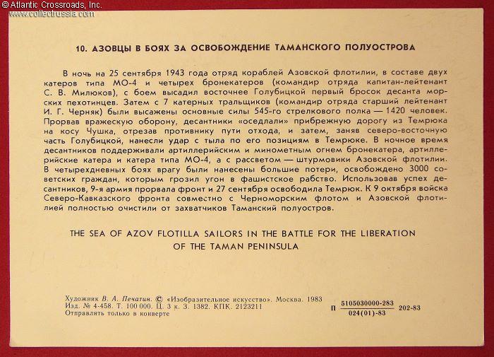 The size is continental standard 6" x 4", unmailable without a cover; published by the Visual Arts Publishing House, circulation 100,000. The postcard is #10 in a set showcasing the Soviet Navy during the Patriotic War. The annotation on the reverse is a brief informational about the heroism of the Azov flotilla sailors and the role they played during the September-October 1943 battles that led to liberation of the Taman Peninsula. The artwork is an artist's rendition of the scene. The artist's name, V. Pechatin, is printed at the bottom on the reverse.
