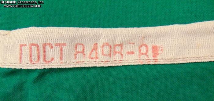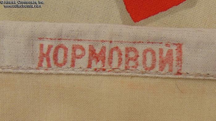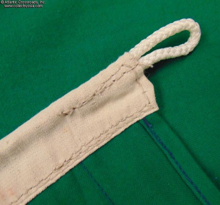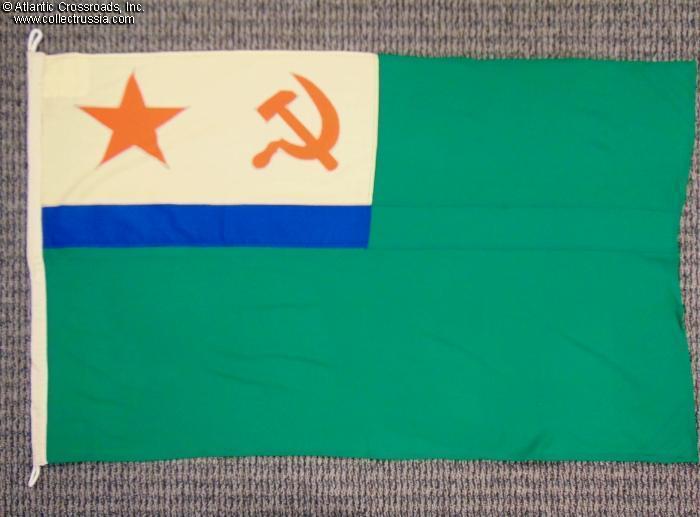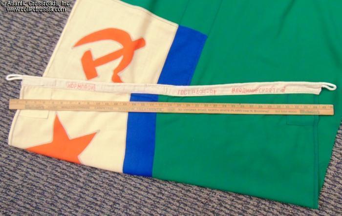 In wool bunting. Medium size, 56" long x 34" wide (approx. 4.5' x 3'). Features green field with a regular naval ensign in the upper left corner. The hoist sleeve shows Vladimirskya Factory manufacturer's stamp and the GOST standard mark indicating that the pattern was authorized in 1981. There is also a stamp "кормовой" on the hoist sleeve indicating that this particular flag has to be flown from the ship's stern.