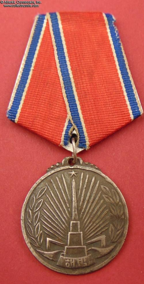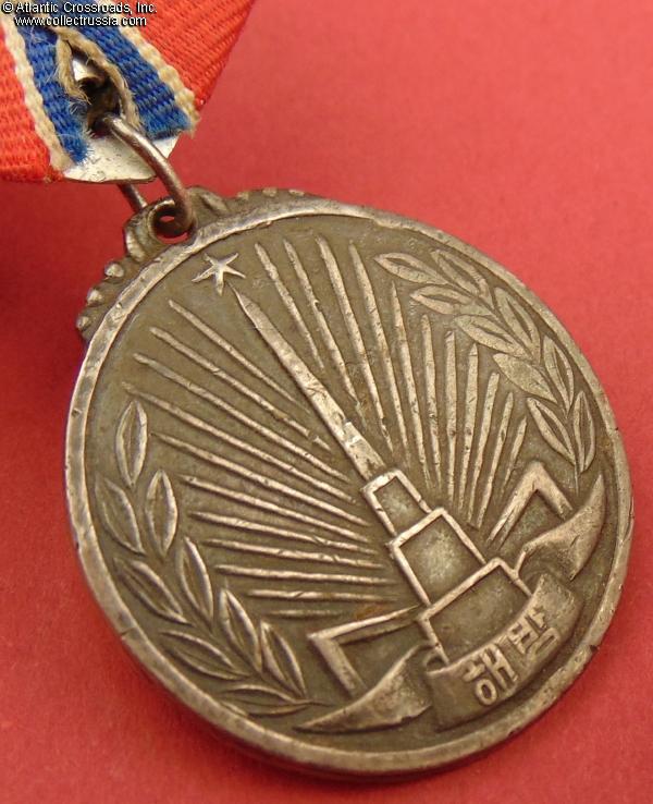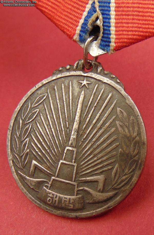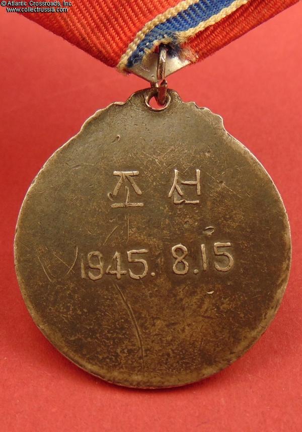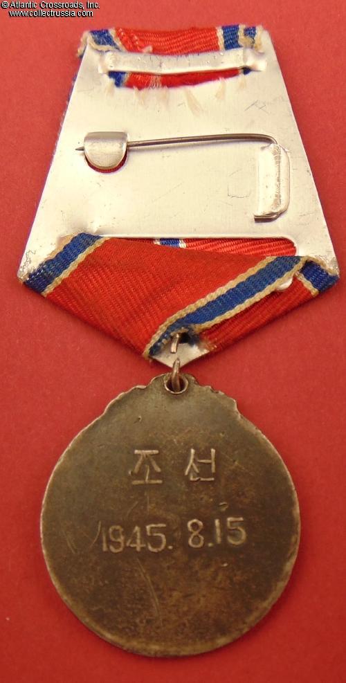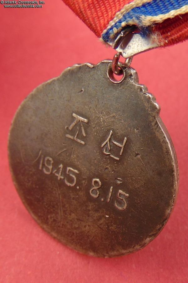 Established in October 1948, this medal was among the first decorations of DPRK. It was awarded to Soviet Army personnel who fought in Korea against the Japanese in the last days of WW2. Soviet servicemen, especially career officers and NCOs who remained on active duty after WW2, often wore the medal on a Soviet-style suspension to keep it in line with their other decorations; it was common in such cases to use any Soviet medal ribbon of similar colors as an ad-hoc replacement because the correct Korean ribbon was nowhere to be found.