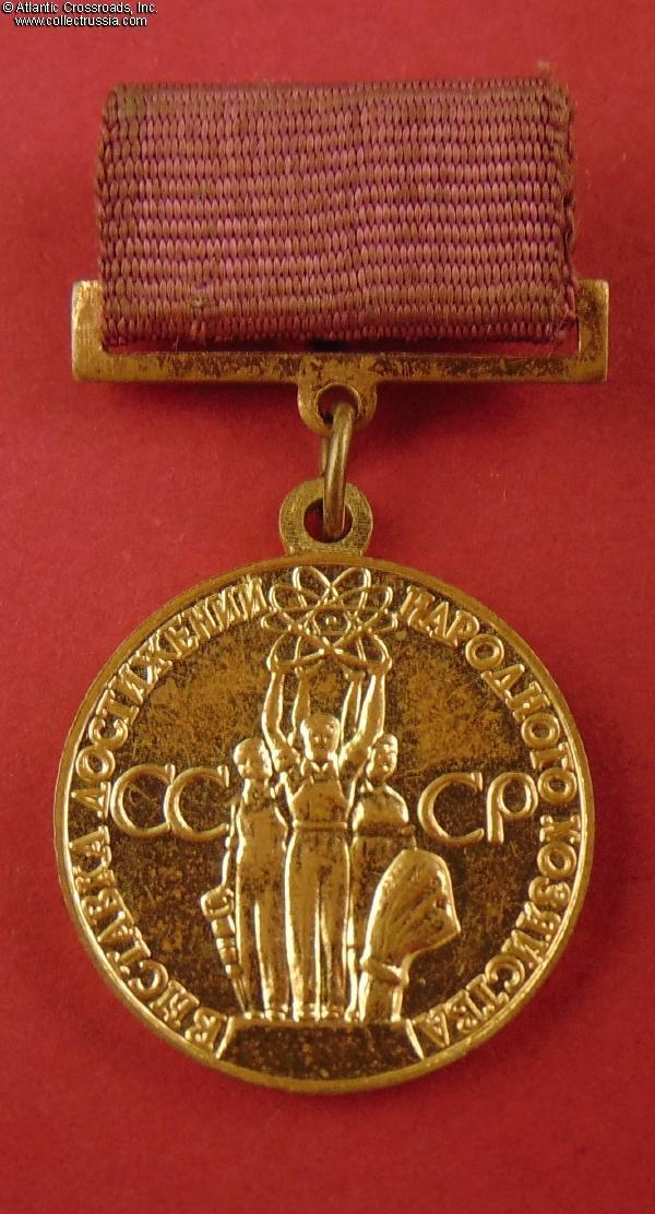 Originally founded in Moscow in the late 1930s as the All-Union Agricultural Exhibition (VSKhV) to be a year-round celebration of the achievements of the USSR, the huge, world fair-like, complex changed its name in 1956 to Exhibition of Achievements of the National Economy when it was decided that its name needed to reflect the broader nature of the exhibits and competitions being held there. Several judged competitions were held on the grounds virtually every week of the year and these medals were given to the winners. The exhibition area still exists today in all of its socialist glory although many former exhibit areas are now occupied by small retail shops.