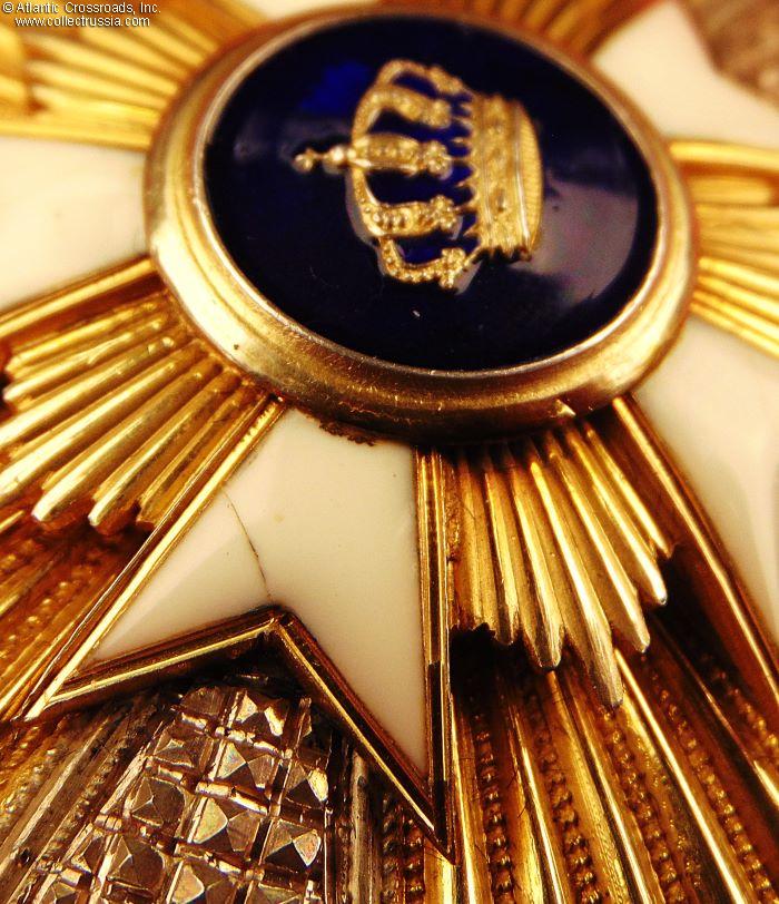 The obverse is in very fine to excellent condition, the only wear visible to the naked eye being the hairline to the white enamel of the 9 o'clock ray of the cross. There are two microscopic flakes to the blue enameled background of the crown next to tiny dints to its rim, approximately at 3:30 and 5 o'clock, practically invisible without strong magnification. The reverse is very clean, the name of the maker and his Brussels address are clearly vi