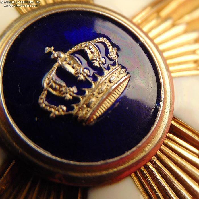 The obverse is in very fine to excellent condition, the only wear visible to the naked eye being the hairline to the white enamel of the 9 o'clock ray of the cross. There are two microscopic flakes to the blue enameled background of the crown next to tiny dints to its rim, approximately at 3:30 and 5 o'clock, practically invisible without strong magnification. The reverse is very clean, the name of the maker and his Brussels address are clearly visible on the center medallion. Unfortunately, the clasp to hold the pin closed is missing.