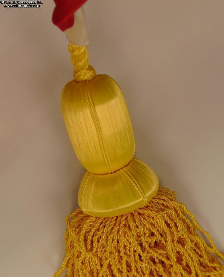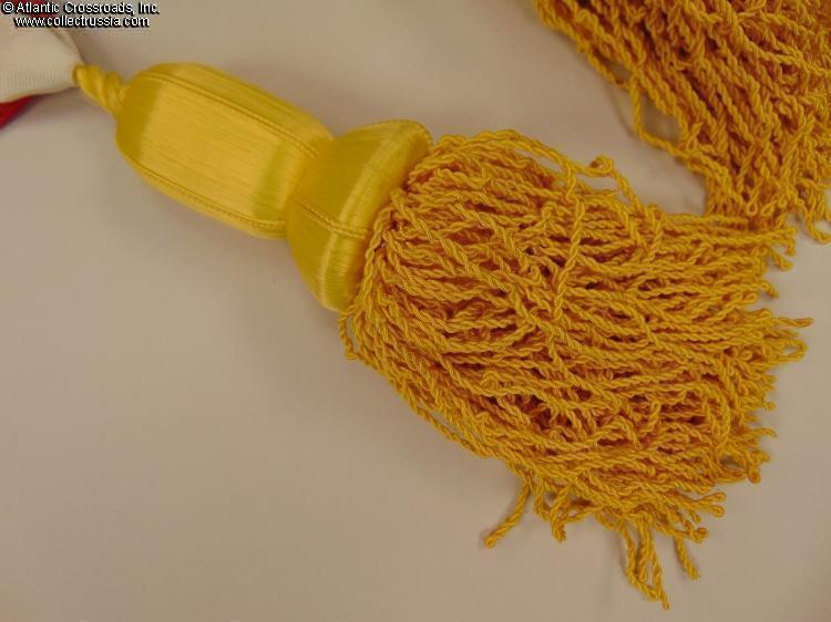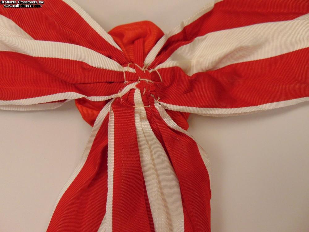 In high-quality red moiré silk with white stripes, approx. 4" in length. The set is complete, including the appropriate rosette and tassels.