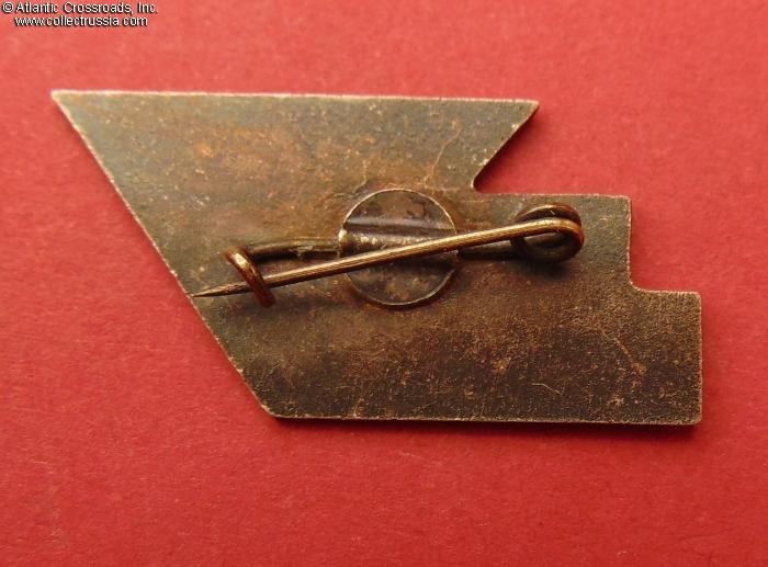 In brass with nickel plating and enamels; measures 16.8 mm in height (incl. eyelet) x 34.1 mm in width. Shows the silhouette of a civil airliner and a triangle representing the brick trowel, the emblem of Soviet student construction units. The inscription on top is the Russian acronym of the school РКИИГА ("RKIIGA") and at the bottom ССО ("SSO") for "Student Construction Unit".