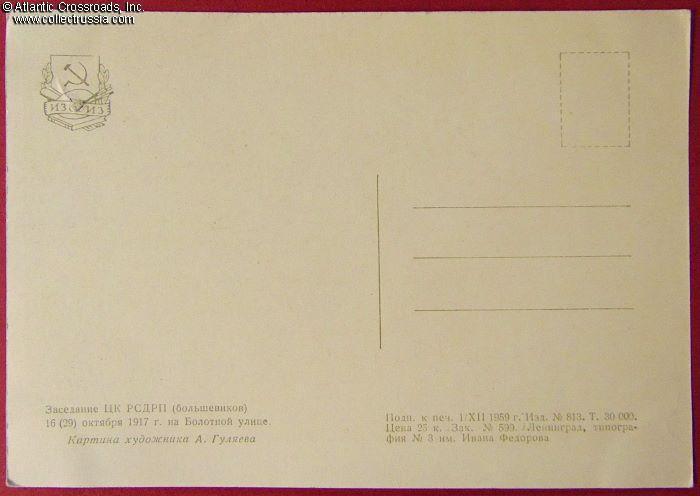 The size is continental standard 6" x 4", postally unused and unmarked, published by IZOGIZ, circulation 30,000, very small by Soviet standards. The artwork is an offset print of an oil-on-canvas painting by A. Gulyaeva depicting the historic meeting of the Bolsheviks' Central Committee that took place on 16 (29) October 1917 in the apartment of K. Shantser at 13 Bolotnaya Street in Petrograd. Chaired by Lenin, the meeting approved the beginning of an armed revolt and founded the Military-Revolutionary Center which would lead and direct the uprising.