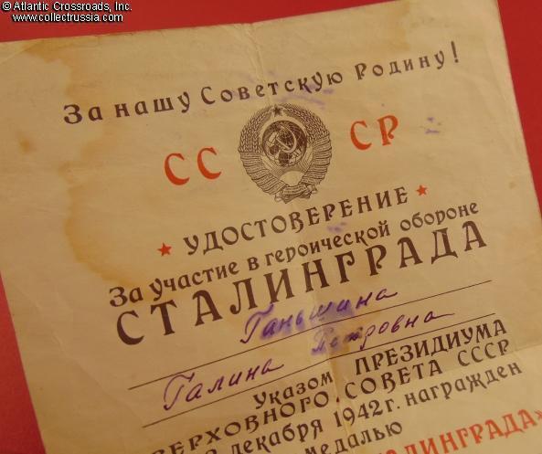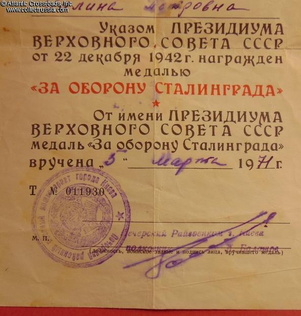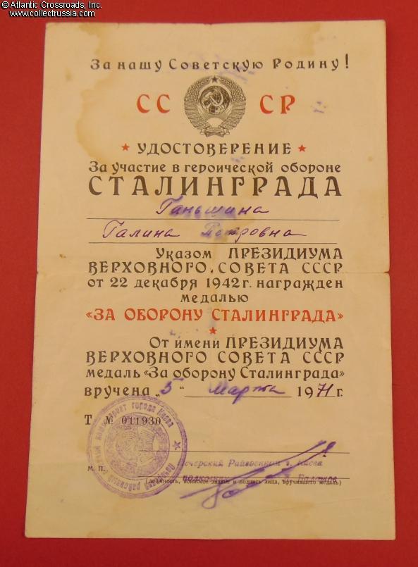 Award Document for the Defense of Stalingrad Medal, Series T #011930, awarded on 5 March 1971 to Galina Ganshina (Галина Петровна Ганьшина).