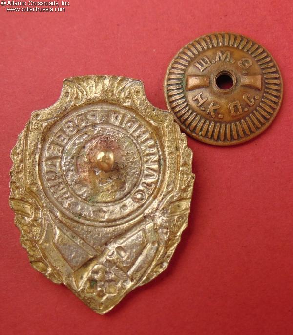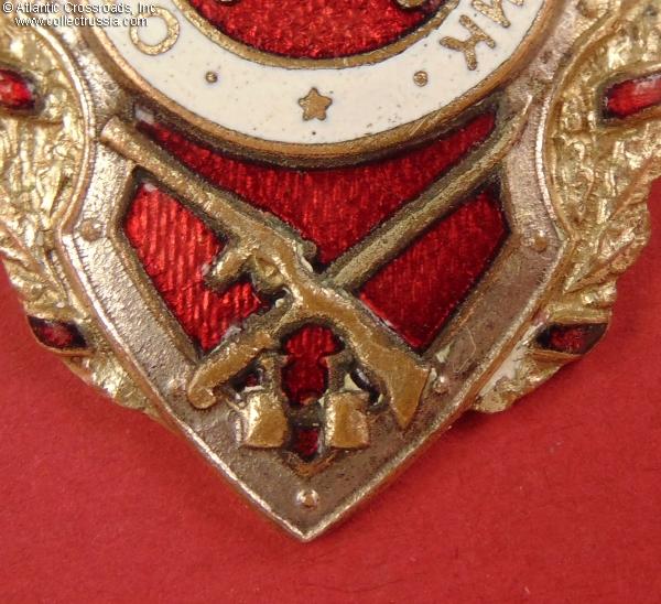 In excellent condition, extraordinary for a "combat proficiency" badge of the WW2 era. Both the red and white enamels on the shield are essentially perfect and show a beautiful luster; there are only a few microscopic contact marks invisible without magnification. There are some tiny surface flakes on the red scrolls on the wreath - the most vulnerable spot of this badge - but the scrolls are overall intact and the wear is almost unnoticeable to the naked eye. Details of the wreath, Dyagterev rifle and sword are perfect and exceptionally crisp; the original gilt finish on the wreath and bright silver finish on the edge are exceptionally well-preserved. The silver finish on the reverse is pristine. The screw post is full length, approx. 10.5 mm, and includes a WW2 NKPS screw plate in brass- and nickel-plated steel which is a period original, correct for this version of the badge, and fits perfectly.