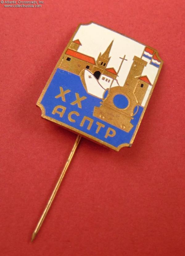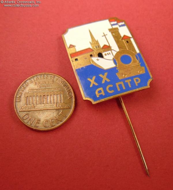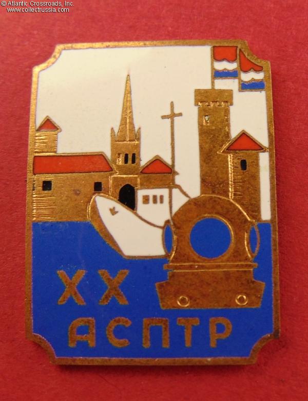 Brass, enamels; 30.2 x 23.1 mm. Features a Russian-language inscription АСПТР ("ASPTR"), scuba-diving helmet, a view of Tallinn's harbor and its iconic Toompea Castle tower with the flag of Estonian SSR. Extremely nice quality, especially for a relatively late Soviet badge. Excellent condition.