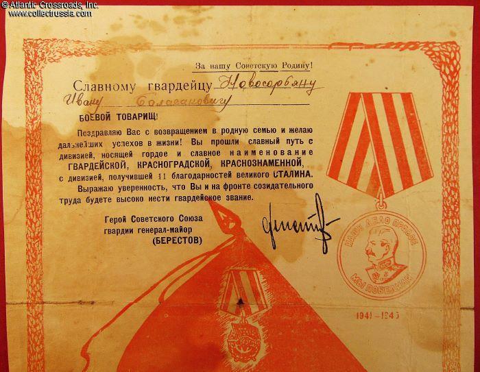 Honorable Discharge Certificate to a Serviceman of 72nd Guards Rifle Division, Hand-Signed by Hero of the Soviet Union Maj. Gen. Berestov, 1945-47. Uncommon, G/VG condition.
