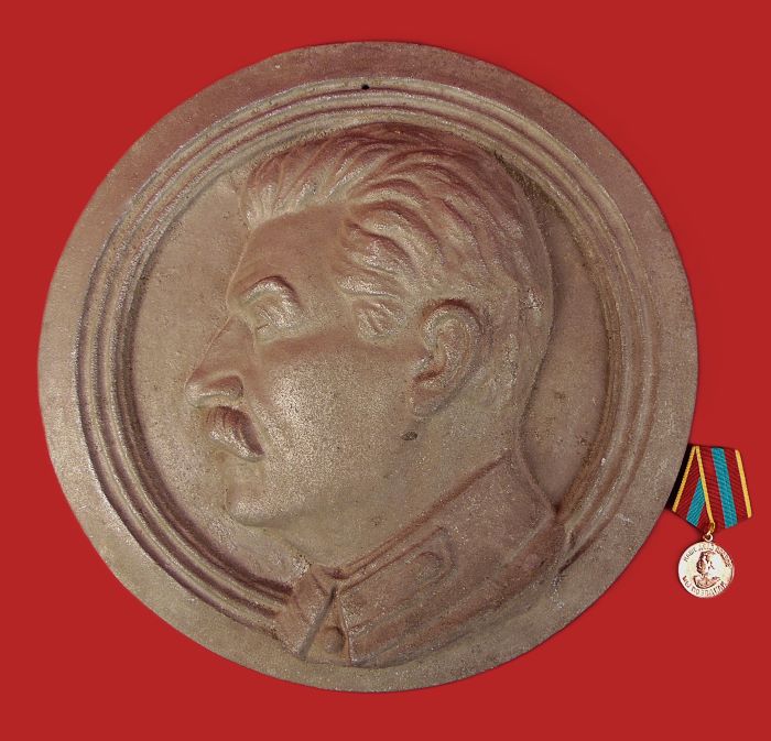 Round wall-plaque with sculptured profile of Stalin, late 1940s through mid 1950s. Shows Stalin in Generalissimo uniform with Gold Star "Hammer and Sickle" award.