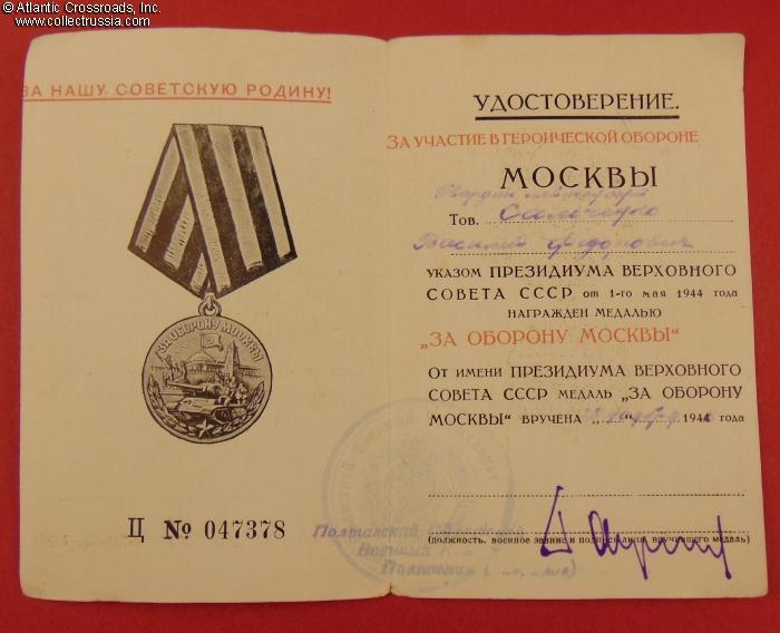 Award Document for a Medal for the Defense of Sevastopol, Dec. 1944 issue to the
