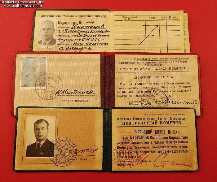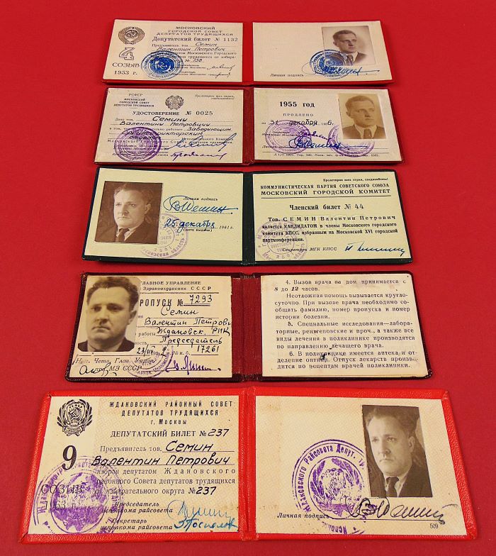 Group of 5 IDs of a High-Ranking Party Official in Moscow, 1953-63. Includes pass to special healthcare facility for top party officials. EXC condition.