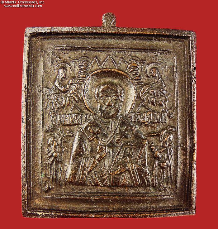 Small Russian Orthodox Icon of St. Nicholas of Mozhaisk, in bronze, 3" x 2", XVIII C. VG condition.