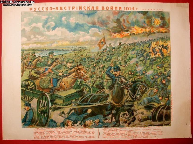 "Defeat of the German Troops at Gumbinen", 1914 lithograph by Sytin workshop depicting Cossacks decimating a German cavalry unit. Very good to excellent condition with fresh colors; minor discoloration in the upper margin and couple of tiny tears on bottom edge. A very attractive artwork of cavalry vs. cavalry action is from the era when such engagements were becoming increasingly rare!