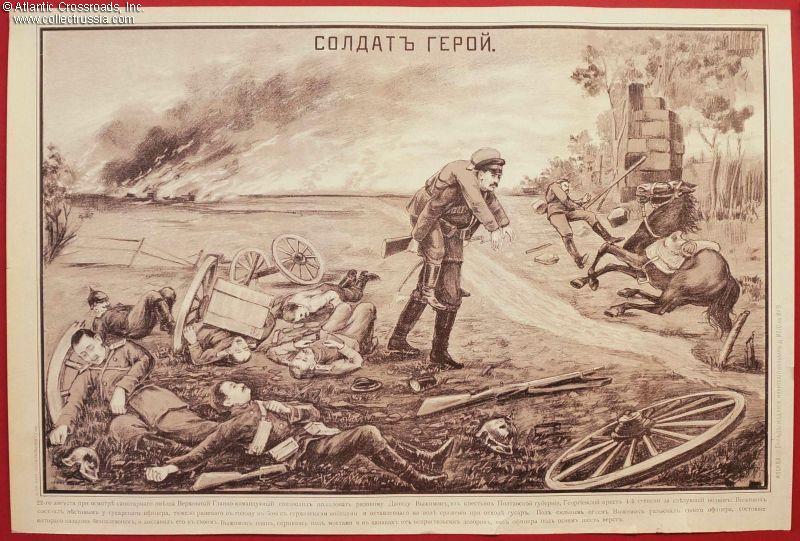 Early WW1 Poster titled "Hero Soldier", summer 1914. Uncommon black-and-white lithograph depicts a heroic Russian hussar who at severe risk to his life rescued a wounded officer abandoned on the battlefield. The solider, Private David Vyzhimok, became one of the fist recipients of St. George Cross during the Great War. In excellent condition.