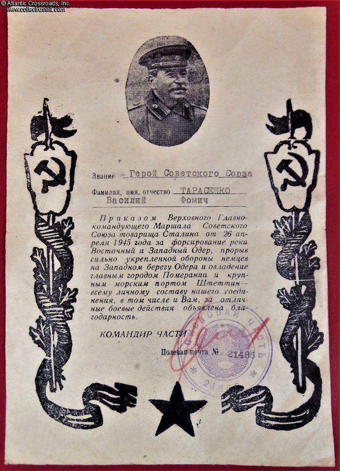 Official Copy of Award Commendation for Hero of the Soviet Union 2 May 1945, the last day of the Battle of Berlin, w. Certified Archival Photo. EXC condition.