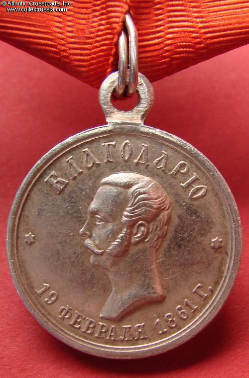 Medal for Efforts in the Emancipation of the Serfs, 1861. Very fine to excellent example showing only minimal wear. Includes original St. Alexander Nevsky ribbon.